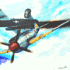 旧海軍局地戦闘機。川西(現・新明和)製。 アメリカ軍のコードネームは「GEORGE(ジョージ)」。 正式名称は紫電21型という。(他に31型等が少数存在した) 公称馬力2000馬力の「誉21型」エンジン、自動空戦フラップ を装備した本機は、海軍最強の局戦として登場したが、 既にその頃、戦局はほぼ決していた。 ベテラン操縦者も数えるほどしかおらず、華々しい舞台を 用意するには、日本軍は弱り果てていた。ただし、 ベテラン中のベテランを集めた、海軍第343航空隊 (別名、源田サーカス)等の、精鋭部隊は、本土に進入してくる 米航空機を相手に、大戦果をあげ、海軍航空隊の終焉に花を添えた。 えらく古い作品です1992年かな?この頃はエアーブラシ の魅力に取りつかれていて、色を塗るのが楽しくてしょうが なかった事を、記憶してます。アクリル絵の具を使って るんですが、筆とかエアーブラシの掃除が、結構大変なん ですねコレが。今、photoshopで描いていて痛感するん ですが、コンピューターって、なんて簡便な絵筆なんだ ろうと(笑)コレもアクリル画です。(B-3ケントボード) | |