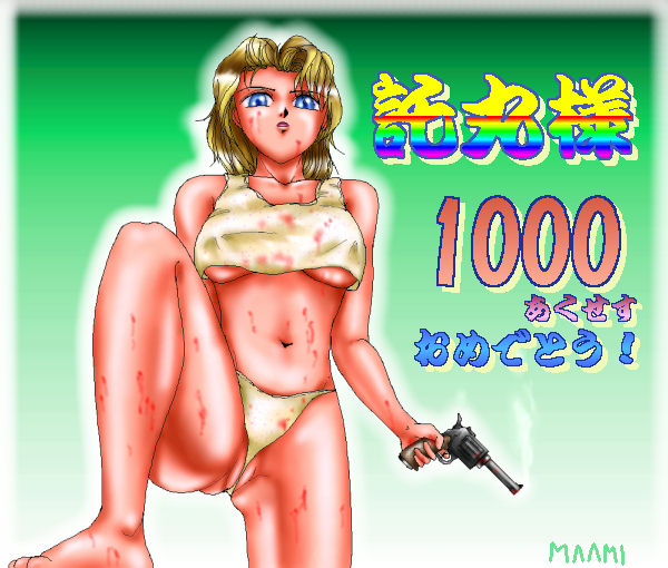 真亜美 里奈 さんから1000アクセス記念CGを頂きました。 忙しいのにどーもです。いやいや、なかなかにワイルドな イラストですね。血のりの主は誰なんでしょう(^^; 真亜美さんは美大のお友達で、漫画家さんです。 ホームページも大々的に発表してますので、 前ページのバナーからアクセスしてみましょう。